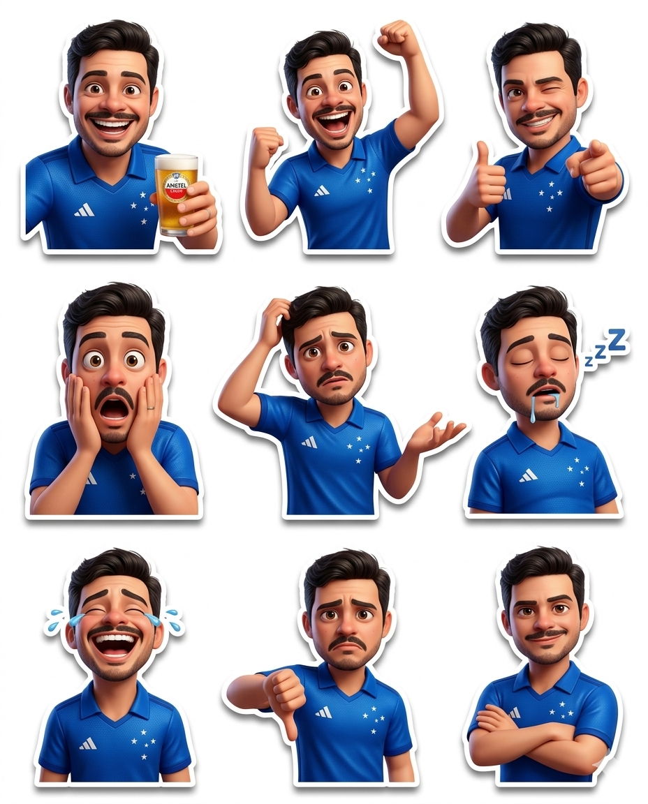 Requisitos de saída: - Layout de grade 3x3 (9 figurinhas no total) - Proporção final: 4:5 - Resolução ultra alta 8K - Fundo branco limpo ou com gradiente suave - Cada figurinha separada com espaçamento claro - Adicione uma sombra sutil sob cada figurinha para dar profundidade.